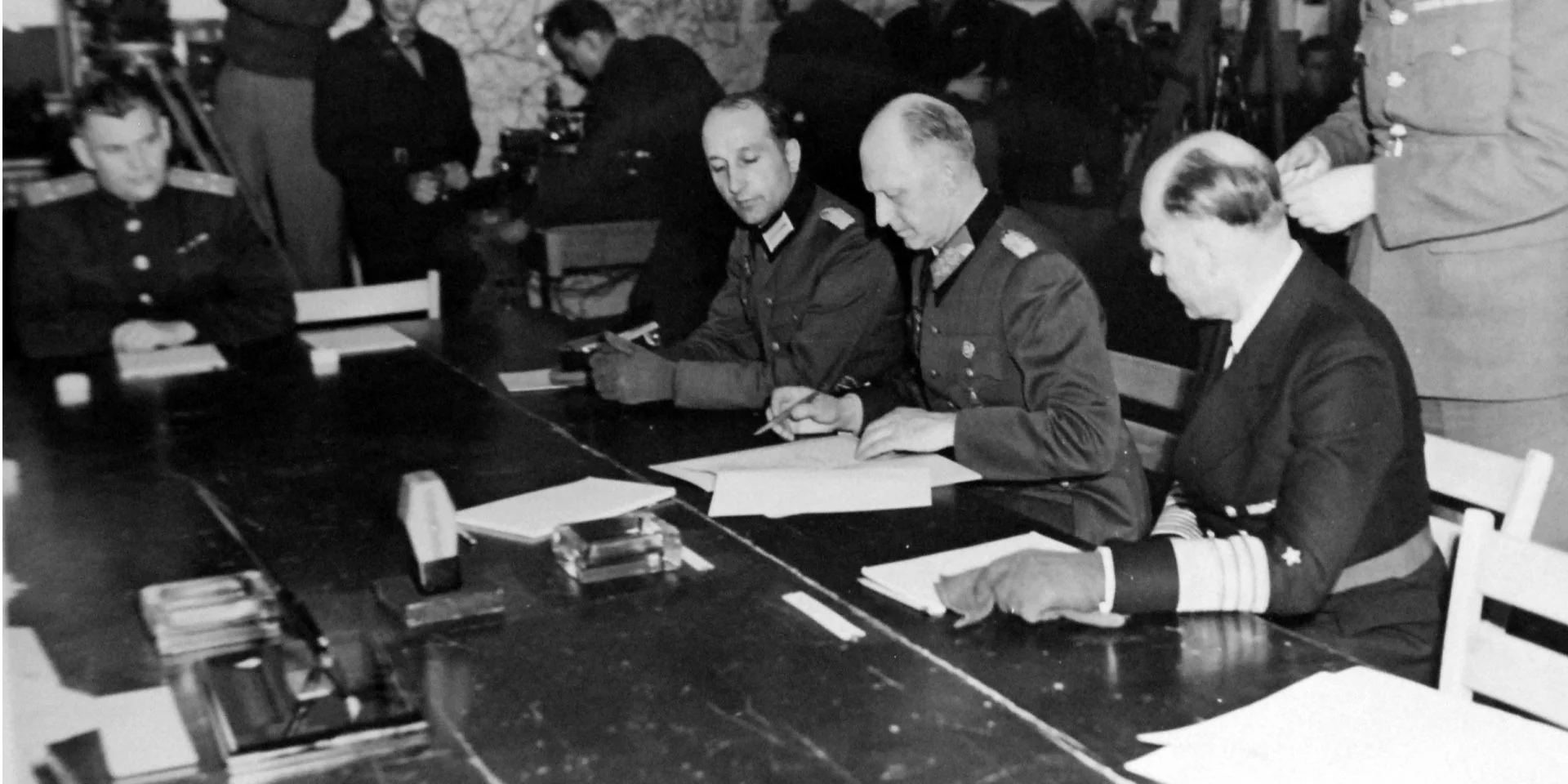З німецького боку його підписали начальник Верховного головнокомандування вермахту генерал-фельдмаршал Вільгельм Кейтель, генерал-полковник люфтваффе Ганс-Юрген Штумпф і грос-адмірал крігсмаріне Ганс-Георг фон Фрідебург, з боку союзників безастережну капітуляцію прийняли маршал Георгій Жуков і заступник …