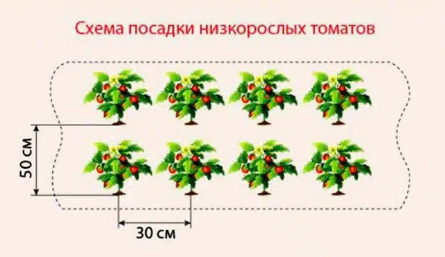 Скороспілим і низькорослим сортам з широкими кущами потрібно створити умови з достатньою віддаленістю один від одного (на 35–40 см), а з боків відстань між ними повинна бути не менше 0,5 метра. Високорослі томати саджають через один, роблячи при цьому великі пропуски – 70 см.
