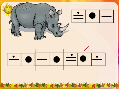 Звуко-буквений аналіз слова носоріг ; Букви: н, о, с, о, р, і, г; Кількість букв: 7 ; Звуки: [н о с о р’ і г]; Кількість звуків: 7 ; Звукова модель: [– ○ – ○ ᐀ ○ –] …