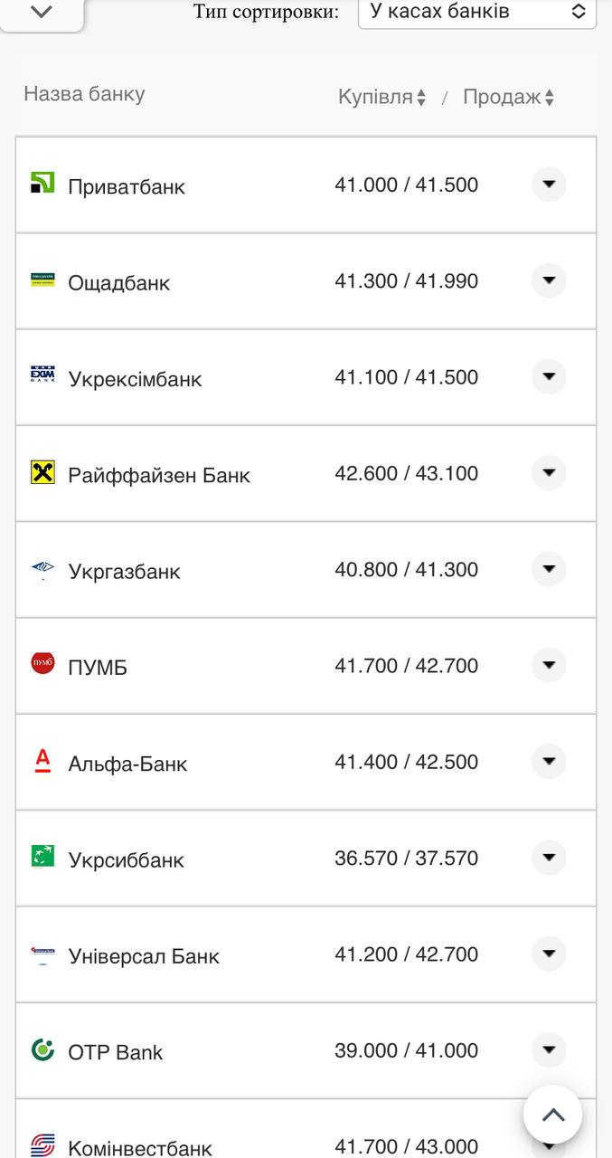 Середній курс валют у банках ; Валюта ; Купівля · 41.33480.1182 · 43.71000.0000 ; Продаж · 41.89880.0182 · 44.36190.0000 …