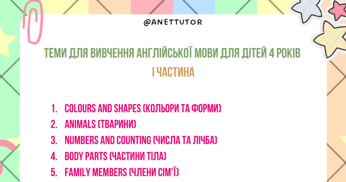 Опис методичного матеріалу: Теми, які діти зазвичай вивчають у процесі вивчення англійської мови, можуть бути різноманітними та включати загальні поняття, які їм буде корисно в повсякденному спілкуванні …
