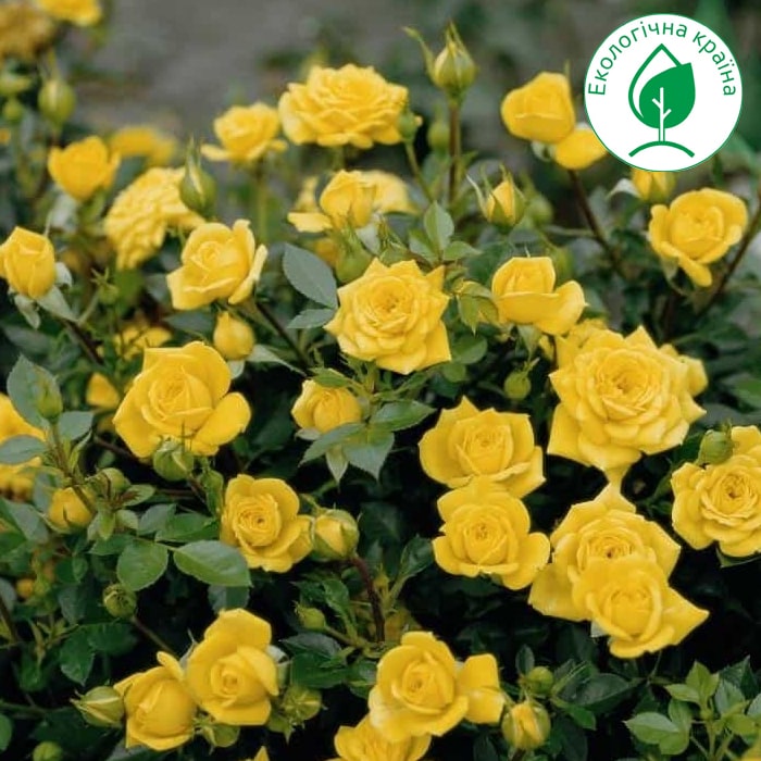 Троянда-спрей “Жовта”. Висота куща 50-60 см, в діаметрі не більше 40-50 см. Листя глянцеві, блискучі, темно-зеленого кольору. Махрові ніжні квіти ніжно-жовтого кольору, які не вигорають на сонці.