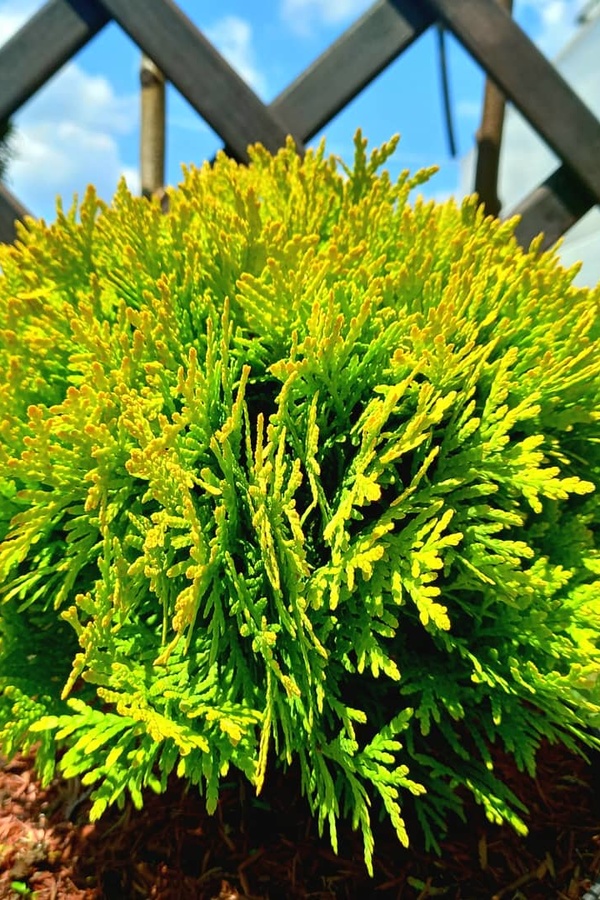 Туя західна Міріам — компактний вічнозелений кущ з яскравою золотисто-жовтою хвоєю, що ідеально підходить для малих садів, бордюрів та альпінаріїв.