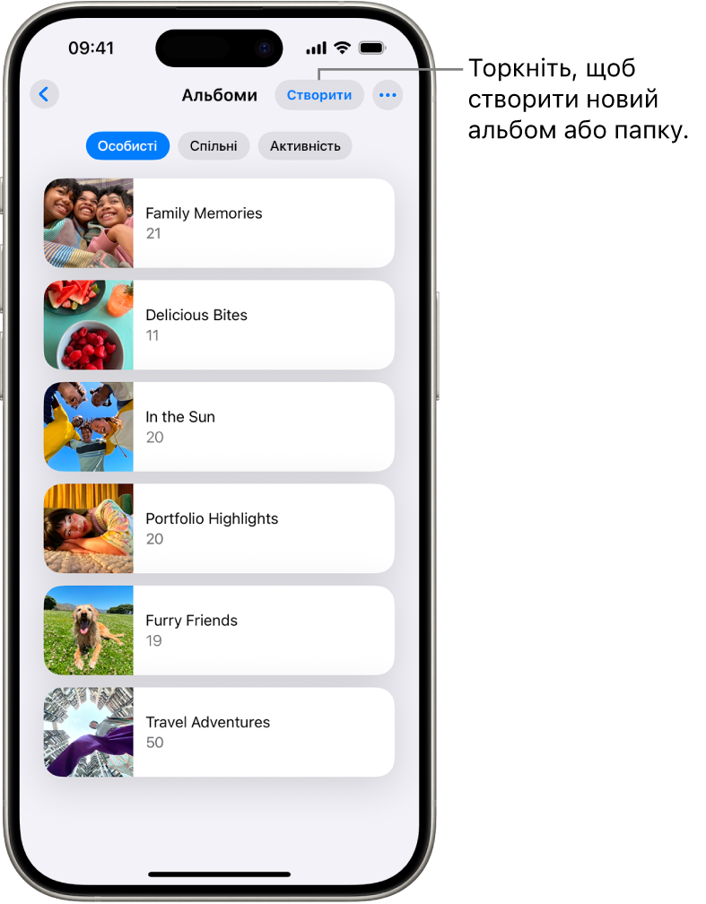 Відкрийте програму «Фотографії» на iPhone. Торкніть «Альбоми», потім — «Створити», а тоді виберіть «Нова папка».