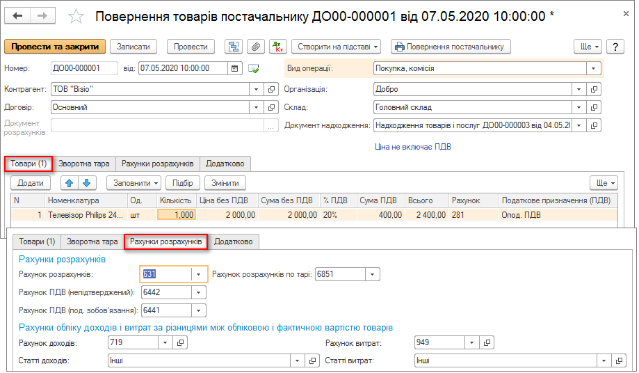 Документ “Повернення постачальнику” призначений для оформлення повернення постачальнику товарів, що надійшли раніше. Цей документ впливає на облік організації у програмі: зменшує кількість товарів тому складі, з якого виконується повернення товарів.