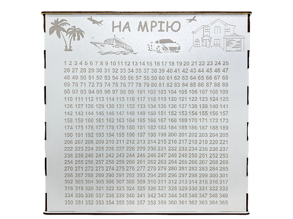 ☝️Зміст цієї скарбнички такий: 💵Щодня кладете в скарбничку будь-яку суму зі списку, який на ній надрукований і ✍️ закреслюєте її маркером. 💪Через 365 днів усі цифри мають бути викреслені та у скарбничці буде 66 785 грн. Матеріал Біле ламіноване ДВП Нанесення – ультрастійка УФ Друк Розмір: 16*23*13 см.