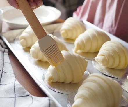 Збити яйце пензликом і змастити ним круасани за допомогою кулінарної кисті, щоб вони були рум'яні. Випікайте круасани 10 хвилин при 200°. Потім зменшити температуру до 180° і випікати круасани ще 12 хвилин.