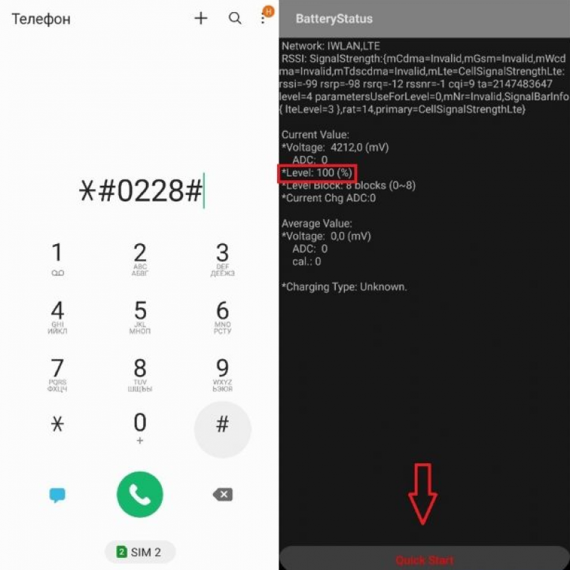 Наберіть на телефоні *#0228#, після цього у вас повинно відкритися вікно з довідкою про поточний статус акумулятора; Натисніть на кнопку "Quick Start", після чого екран смартфона погасне на кілька секунд. Не панікуйте – в цей час відбувається скидання параметрів контролера батареї та оновлення даних.
