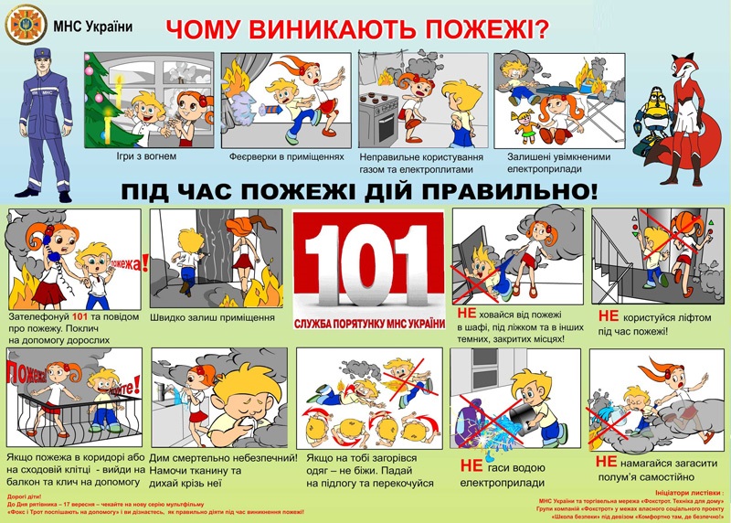 Насамперед слід негайно повідомити про пожежу в пожежну охорону (тел. 101) зачинити двері в класі де горить. Якщо через вікно побачите охоплене вогнем приміщення, не намагайтеся увійти в нього. Відчинені двері перешкодять евакуації – раптовий приплив повітря може призвести до поширення вогню з великою швидкістю.