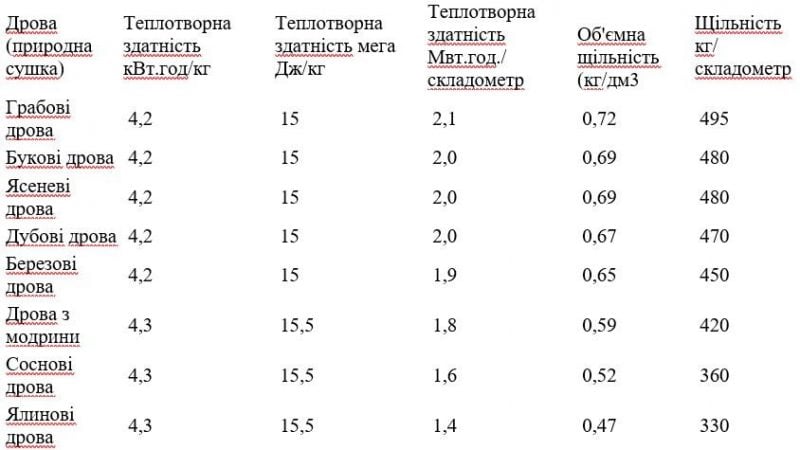 | Порода | Теплотворна здатність, ккал/дм³ | Теплотворна здатність, кВт·год/м³ |