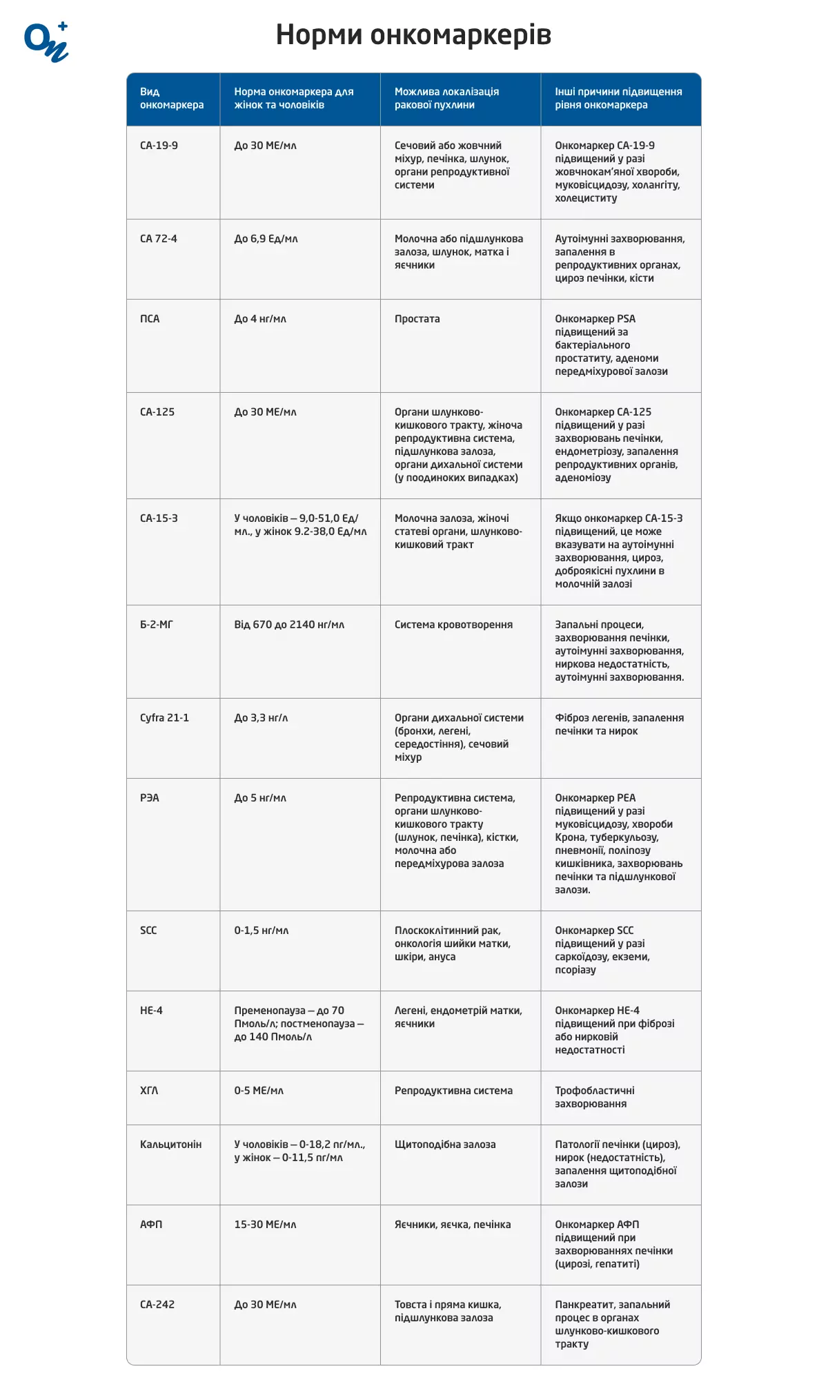 ОНКОМАРКЕР АФП (АЛЬФА-ФЕТОПРОТЕЇН) У дорослих людей норма АФП зазвичай умежах 15 нг/мл. Концентрація вище 10 МО (міжнародна одиниця)/мл вважається патологічною. Підвищений рівень АФП може говорити про наявність таких злоякісних захворювань: Первинний рак печінки (гепатоцелюлярна карцинома)
