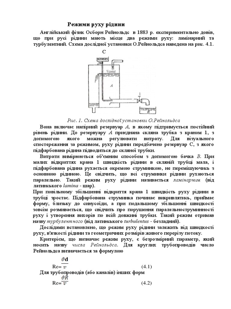 В інженерній практиці зустрічаються два режими руху рідин: ламінарний (від лат. lamina – шар) – рідина рухається окремими шарами (струминками) без перемішування, і турбулентний (від лат. turbulentus – безладний) – рідина рухається з перемішуванням частинок рідини, струминність потоку порушується. PDF