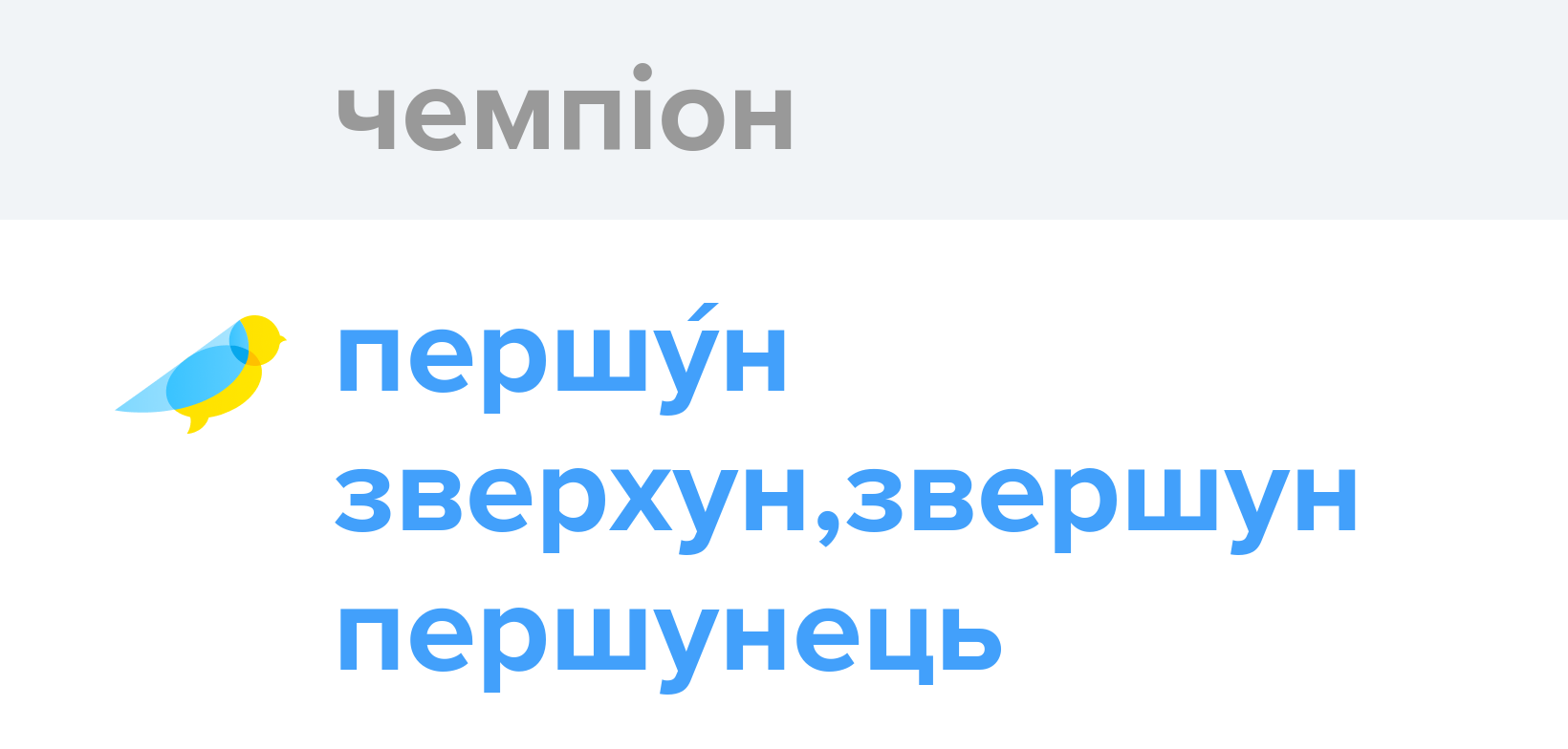 Чемпіон — переможець змагань на першість із якогось виду спорту. Найкращий переклад — Першу́н (11 голосів). Приклад вживання — в деяких видах спорту найвище …