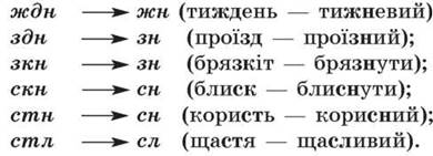 Спрощення вiдбувається: У групах приголосних -ждн-, -здн- випадає д: виїздити – виїзний, тиждень – тижня. У групах приголосних -стл-, -стн- випадає т: щастя – щасливий, честь – чесний.’);}],[{id:’F8FxaP_UAZOxi-gP64S7oQg__17′},function(){window.jsl.dh(‘F8FxaP_UAZOxi-gP64S7oQg__17′,’